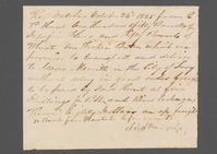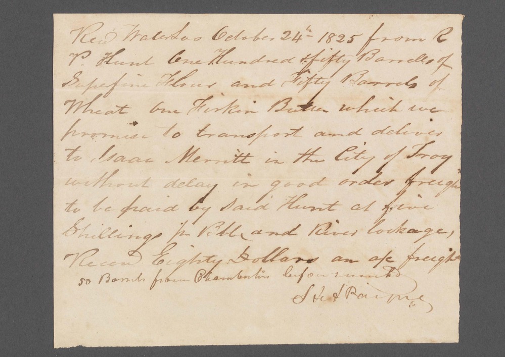 On front of document: “Rec’d Waterloo October 24th 1825 from R P Hunt One Hundred & fifty Barrels of Superfine Flour and Fifty Barrels of Wheat one Firkin Butter which we promise to transport and deliver to Isaac Merritt in the City of Troy without delay in good order freight to be paid by Said Hunt at five Shillings pr Bbl and River lockage, Receivd Eighty Dollars on a/c freight 50 Barrels from Chamberlin before [illegible] S & A Payne” On back of document: "S & A. Payne Recpt for 150 Bbls Flour 50 B Wheat Firkin Butter 10m - 24d - 1825"