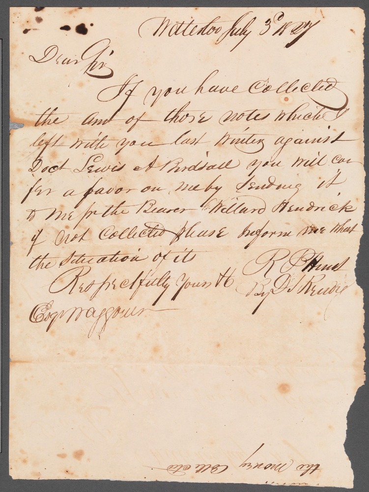 On front of document: “Waterloo July 3d 1827 Dear Sir If you have collected the amt of those notes which I left with you last winter against Doct Lewis A Birdsall you will confer a favor on me by Sending it to me pr the Bearer Willard Hendrick if not collected please Inform me what the situation of it Respectfully Yours &c R.P. Hunt By D J Kendig Esq Waggoner” [upside down on bottom of page]"the Money Collecter" On back of document: "Copy Letter to Esq Waggoner" "9.33 8 ---- 13.3"