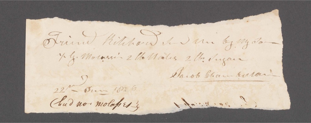 On front of document: "Friend Ritchard Send Me by My [illegible] [2/1?] G. Molasses 2 lb Nails 2 lb Sugar Jacob Chamberlain 22nd Jun 1826 (had no molasses)" On back of document: "J. Chamberlain"