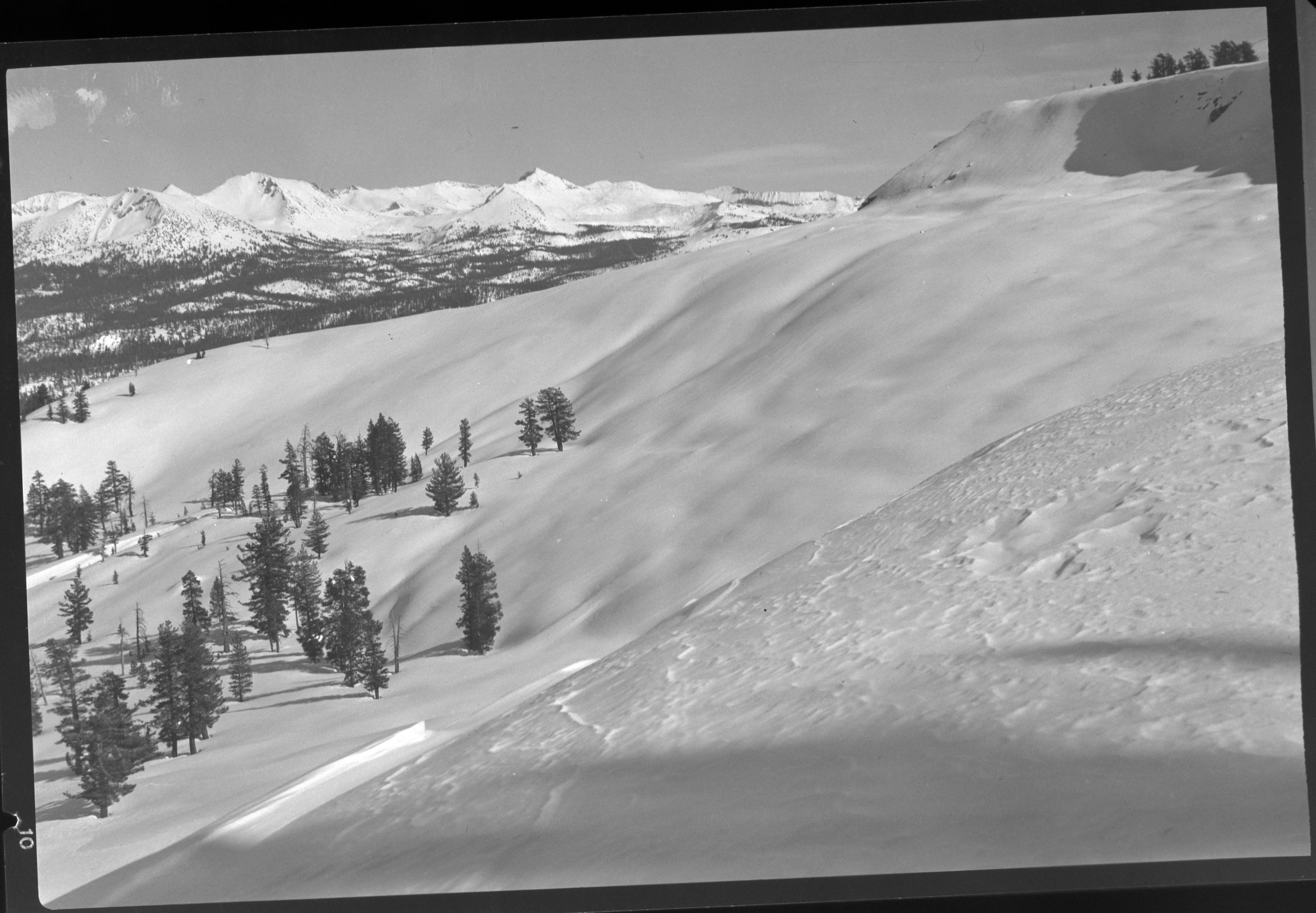 Snow-covered ski slopes from Horse Ridge. [Slopes within easy reach of the Ostrander Lake Ski Hut - Horse Ridge at the right. The spectacular snowcovered Mt. Clark Range in the distance is enticing to skiers for ski tourism. Additional ski huts would be ne