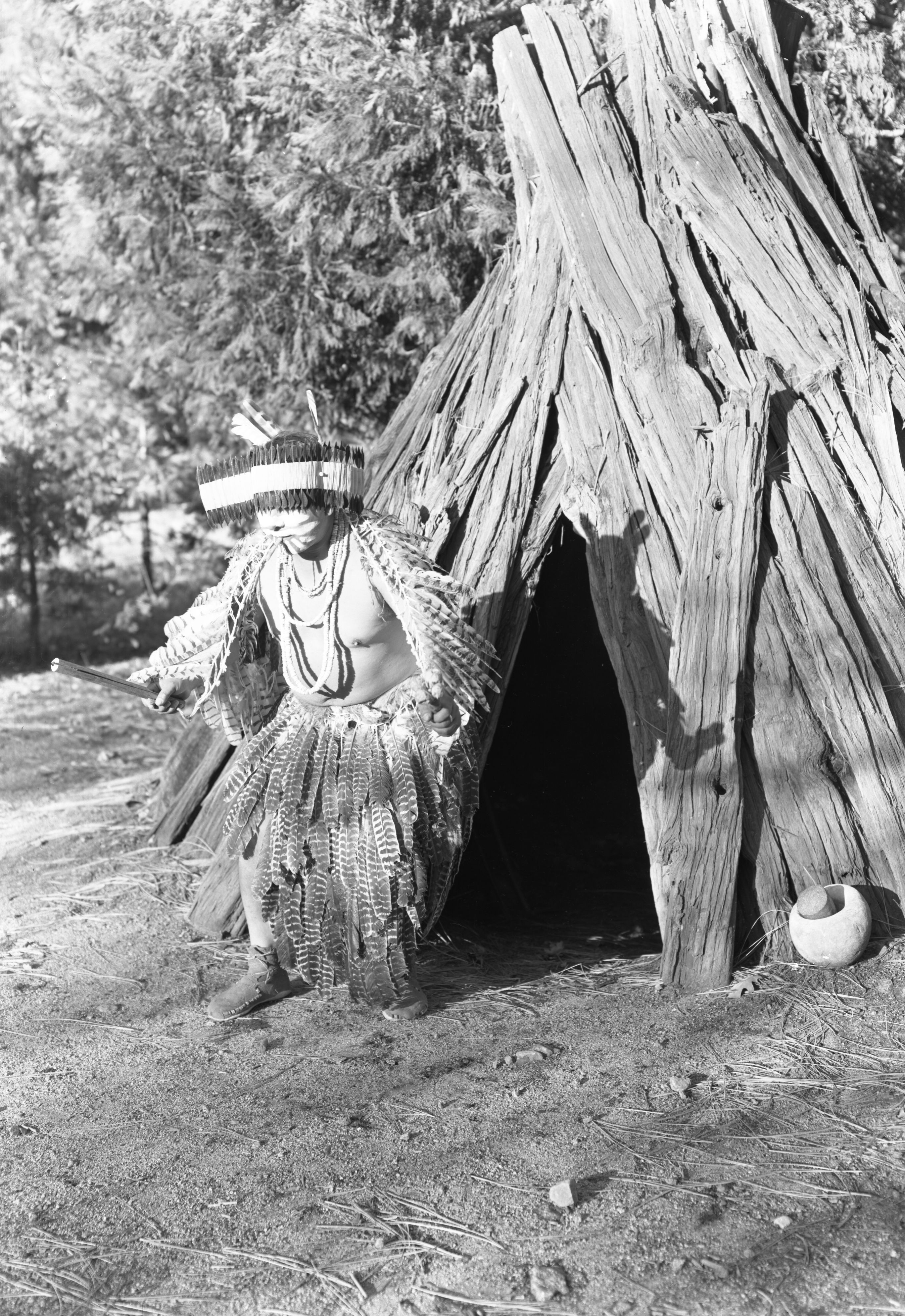 Chielf Le-me in front of Um-a-cha in back of Museum. [Original print in collection. Wearing mixture of traditional and non-traditional Miwok garb.]