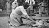 Maggie pounding acorns. Baskets in Yosemite Museum.