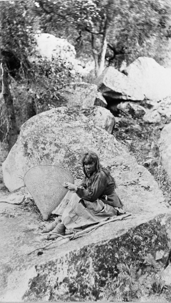 Native American Mary, Yosemite Miwok. Putting a new rimstick on and repairing a Western Mono Burden basket. Copied from a Boysen stereograph (Cat. #8405 - YNP Coll.)
