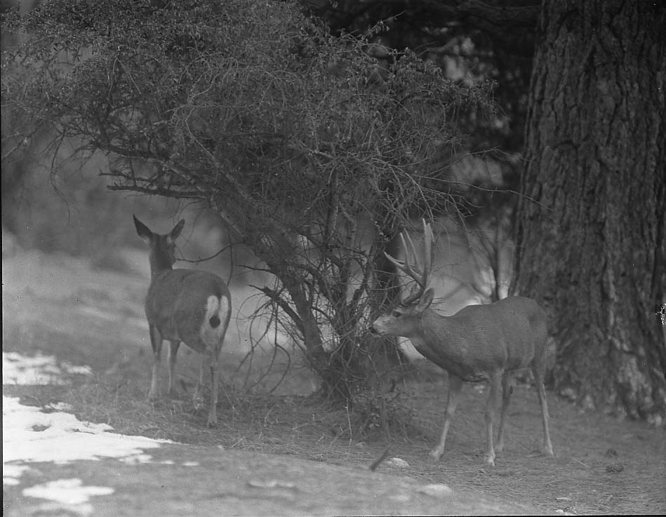Jan 29, 1929, Yosemite, Calif., Deer, mule, doe escaping unwelcome advances of buck by dodging around buck x, J. Dixon, 6 15 11x14 old master, dodge bottom 30s, slide 2 1/2 @ 45, [glass slide]
