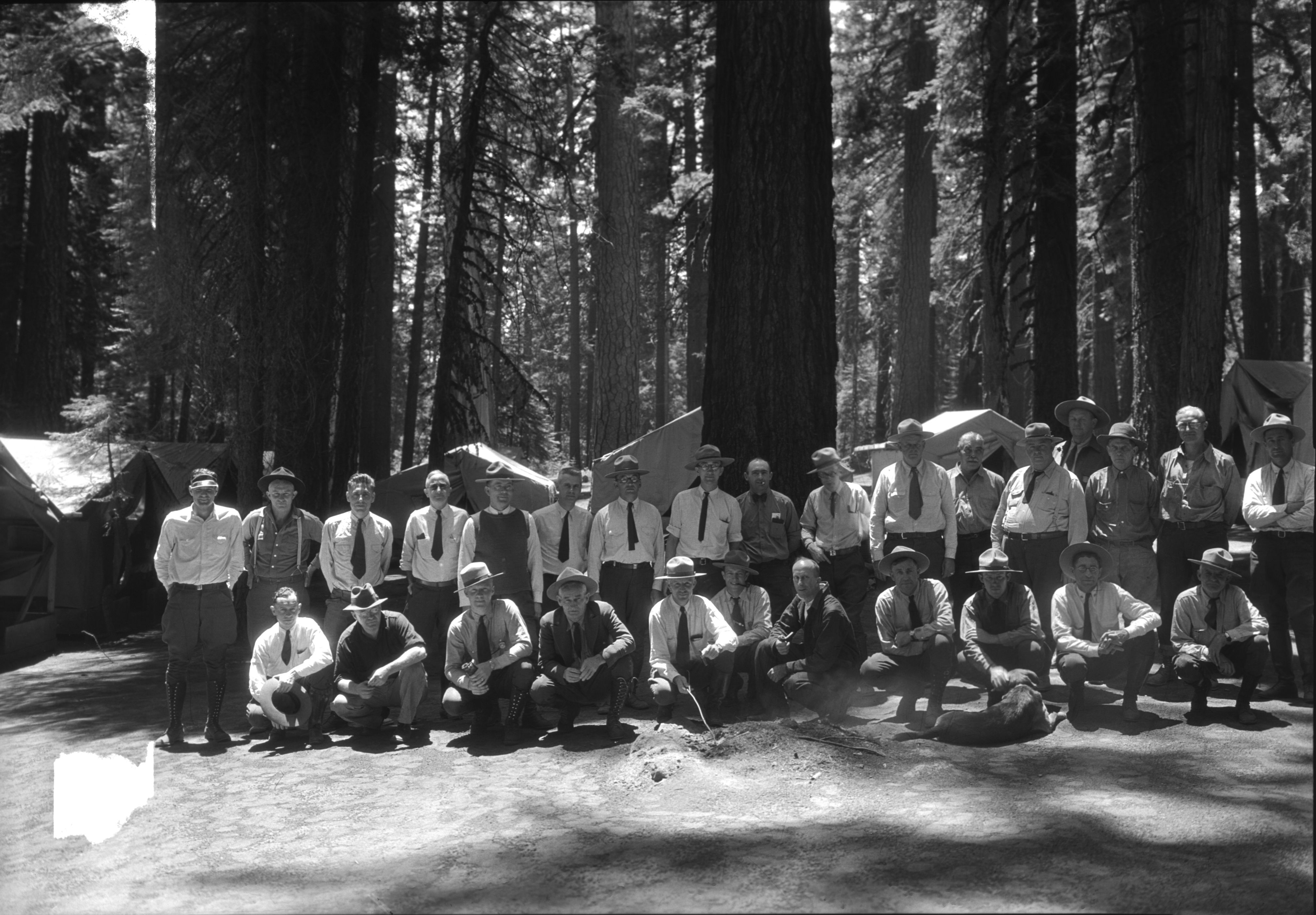 Building Fire School in front of Yosemite Museum. School term - October 18-27, 1948. LEFT TO RIGHT: BACK ROW: Bill Hackman, Mt. Rainier; Stanley McComan, Yosemite; Al Rose, Mt. Ranier, Chief Rang.; Homer Robinson, Yosemite, Asst. Chief; Elmer Fladmark, Gla
