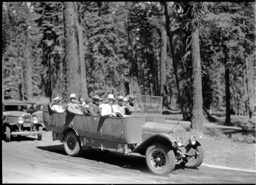 Governor's Party in NPS car #101 at east portal of Wawona Tunnel. Front seat: Col. C. G. Thomson, Supt. & Sec. Georger Dern (Sec. of War). Middle Seat: Gov. Theodore Green of Rhode Island & Gov. James Rolph of Calif. Back Seat: Mrs. Dern & Gov. Ibra C. Bla