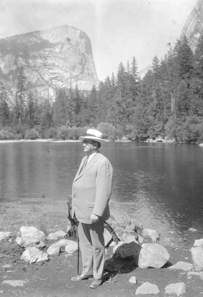 Dr. Huan-Kang Fu, at the Wawona Tunnel. "Dr. Fu, distinguished representative of the Chinese Government, who has been visiting America, photographed at Yosemite National Park, where he made a study of national park administration in view of promoting the e