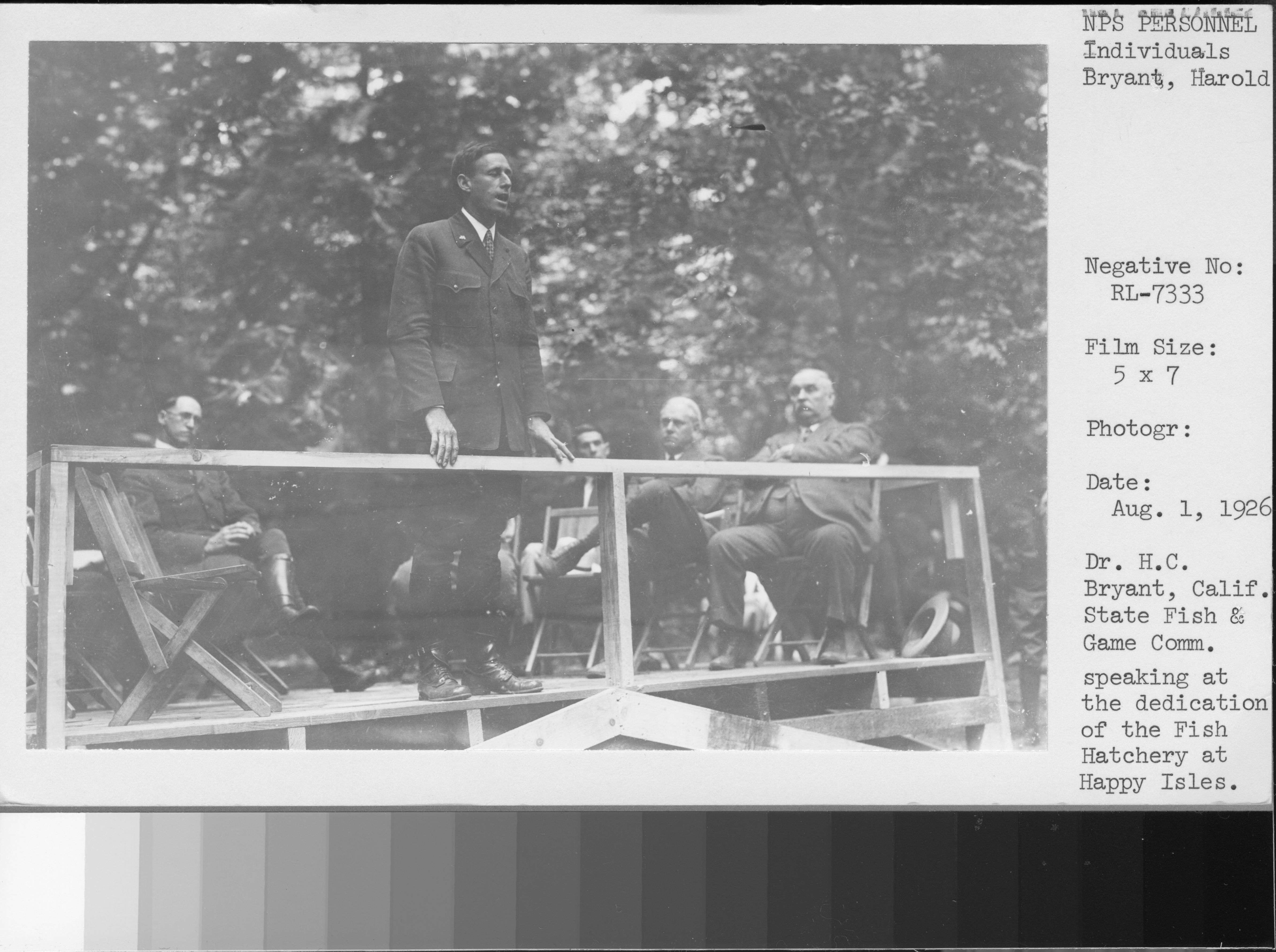 Copy Neg: Leroy Radanovich, May 2001. Nature Guides in front of the Supt's Office in Old Village. Dr. Loye Holmes Miller on the left and Dr. Harold C. Bryant on the right.