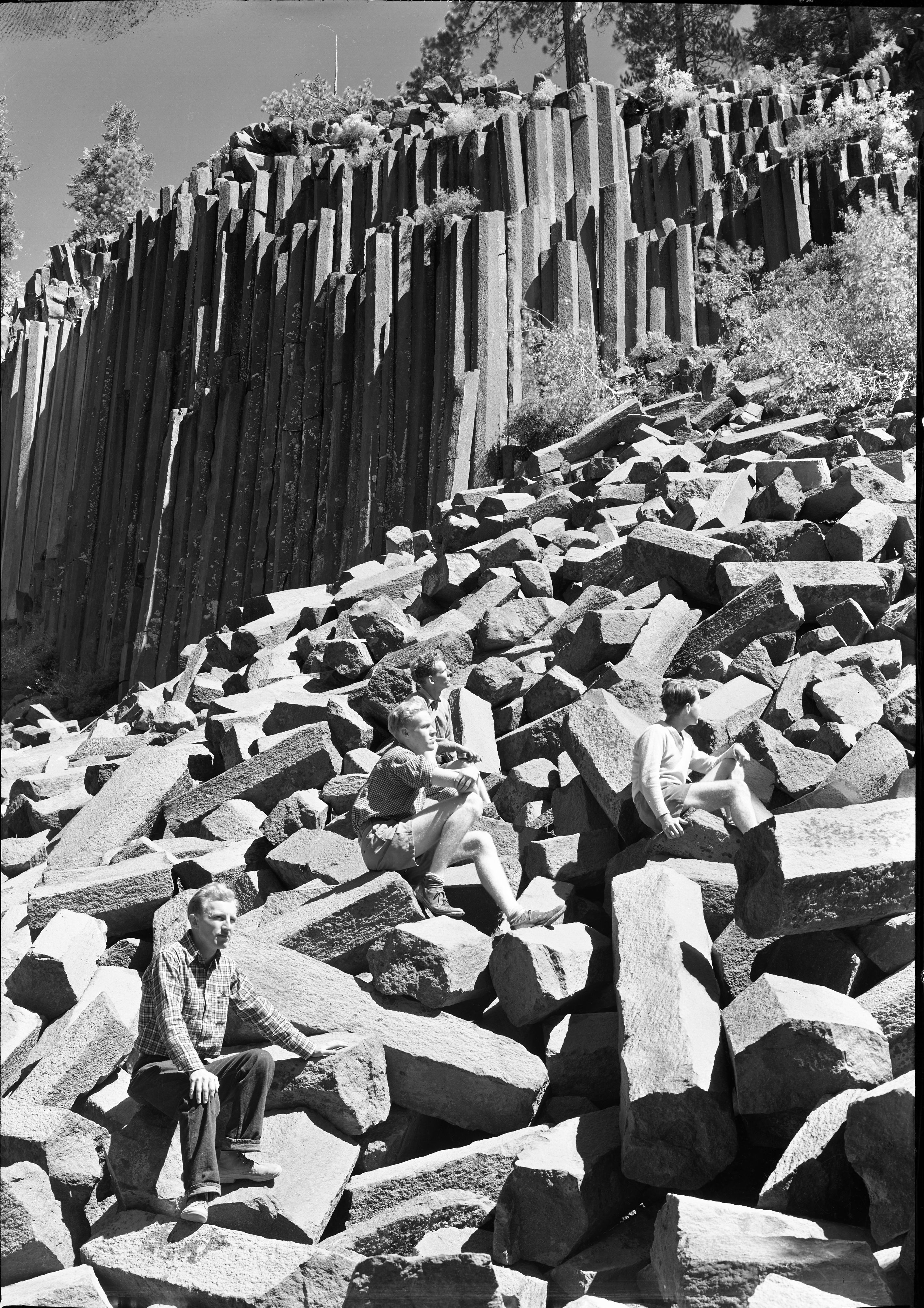 Hikers resting on talus slope of Devil Postpile.