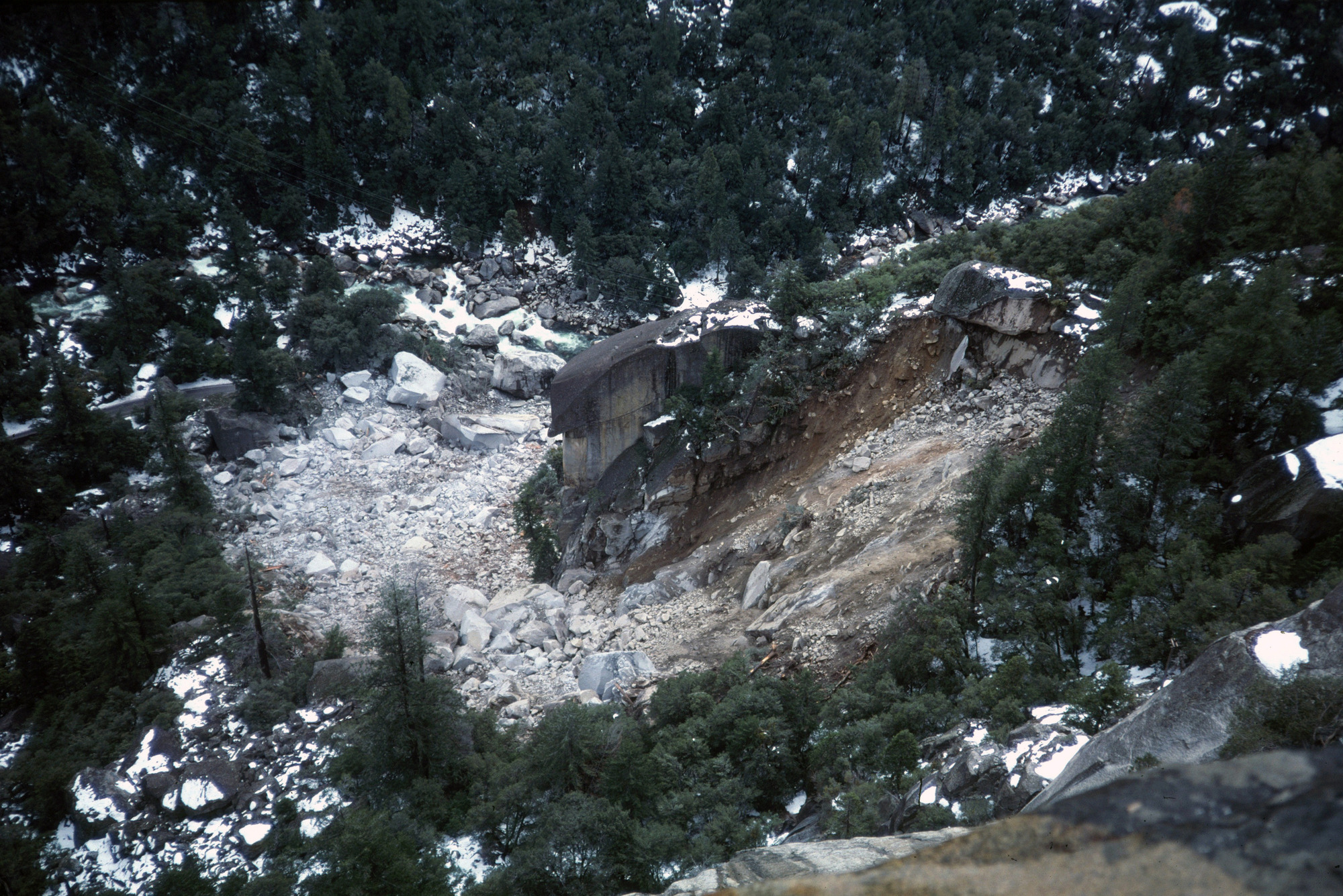 Aerial perspective of a rock slide source area and fresh rock debris. Light colored boulders cover a swath of the slope and destroyed a portion of the road below.