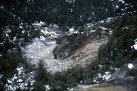 Aerial perspective of a rock slide source area and fresh rock debris covering a swath of the slope and road below. Light snow coverage throughout landscape.