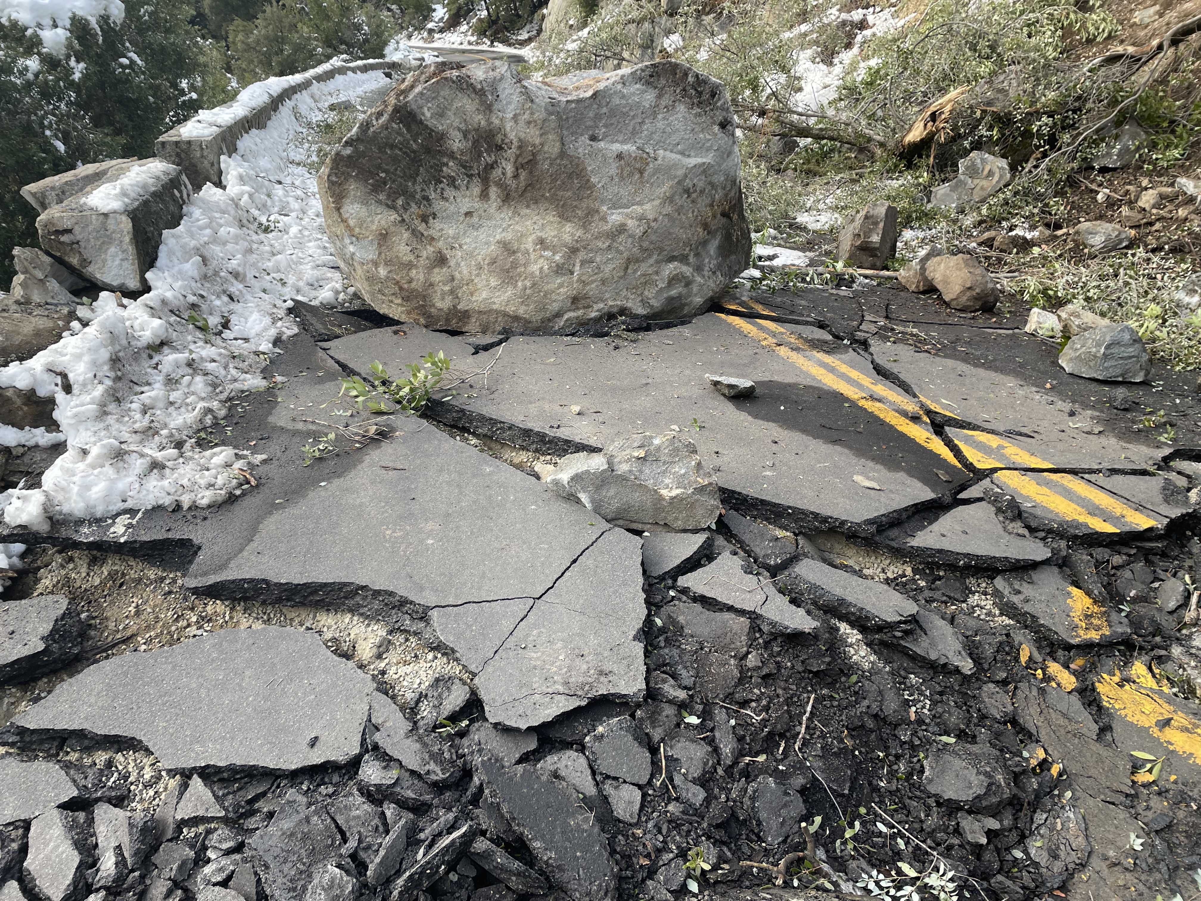 Rock fall debris covers and damage a road.