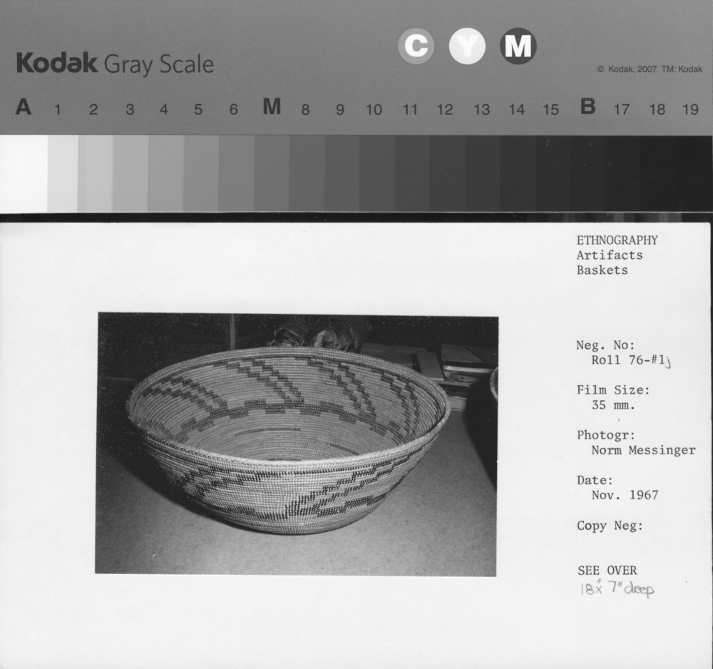 Miwok type cooking basket with heavy repair. Cat. No. 24,878 (YNP Collection) on loan from the State of California., Department of Parks & Recreation. Technology is similar to same Maidu work. Horizontal band design in split red bud shoots.
