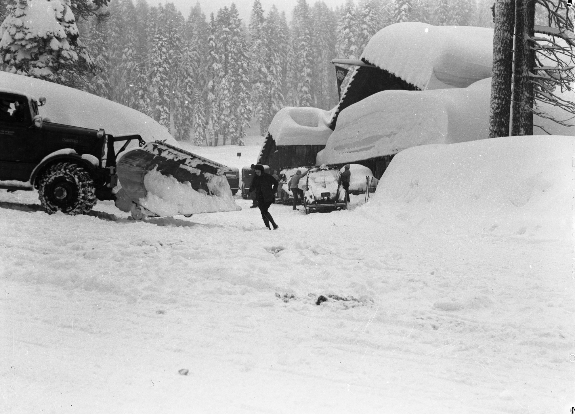 Badger Pass under 14 ft. snow depth. E.C. Smith and Ed Renner, engineers, pose to show depth.