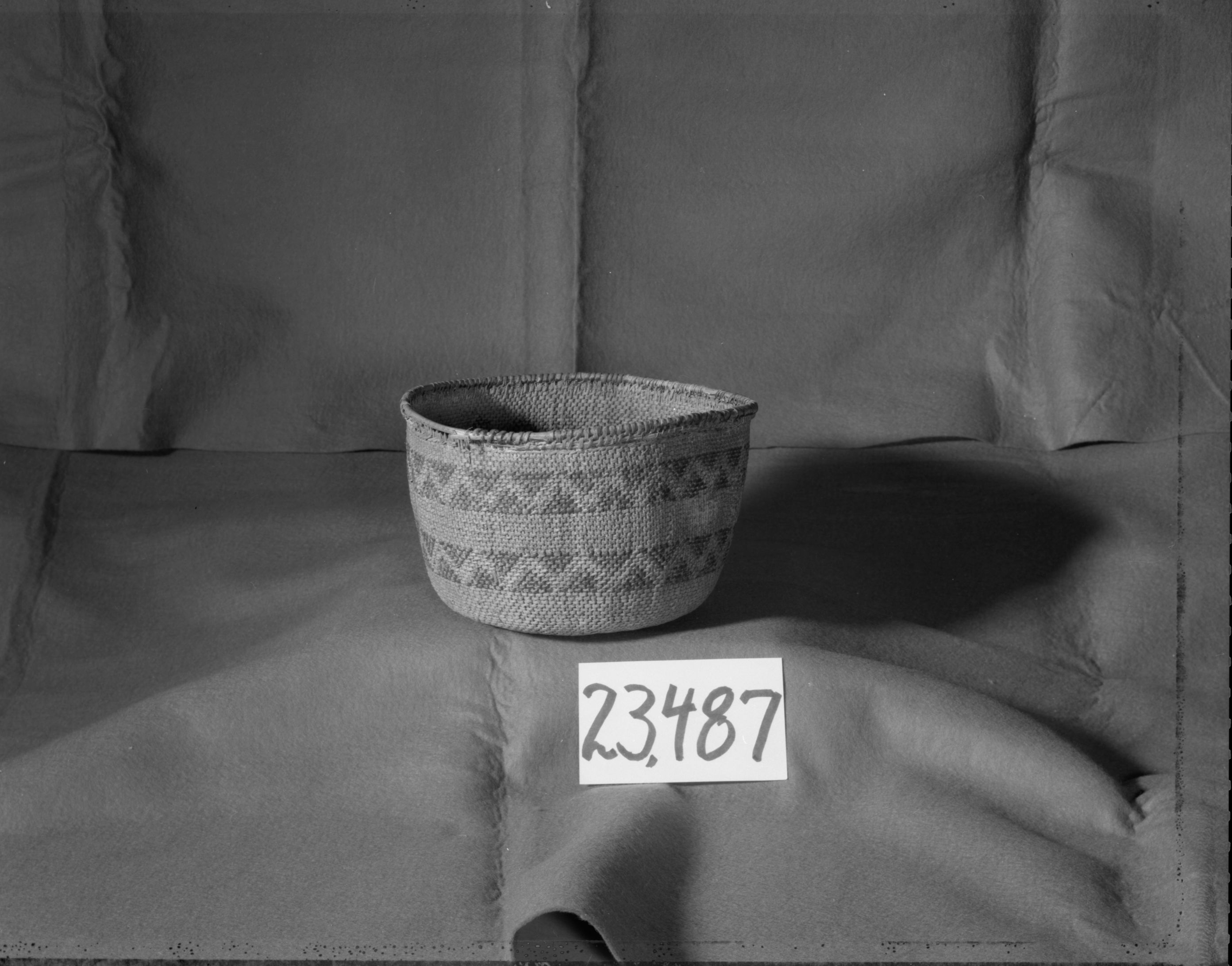 Western Mono cooking basket. Made by June Whaley, 1912 from the Frank Latta collection. Unidentified split shoot (redbud?), diagonally twined. Measurements: top diameter 21 cm, height 14 cm. In the YNP Collections - cat. no. 23,487.