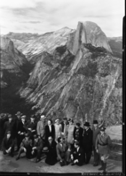 General Somoza with rangers at Glacier Point. Left to right: Chief Ranger Townsley, Ranger Cliff Anderson, Ranger Jerry Mernin, Gen. Somoza, Pres. of Nicaragua, Gil Waterman, temp. ranger, John Wosky, Asst. Supt.