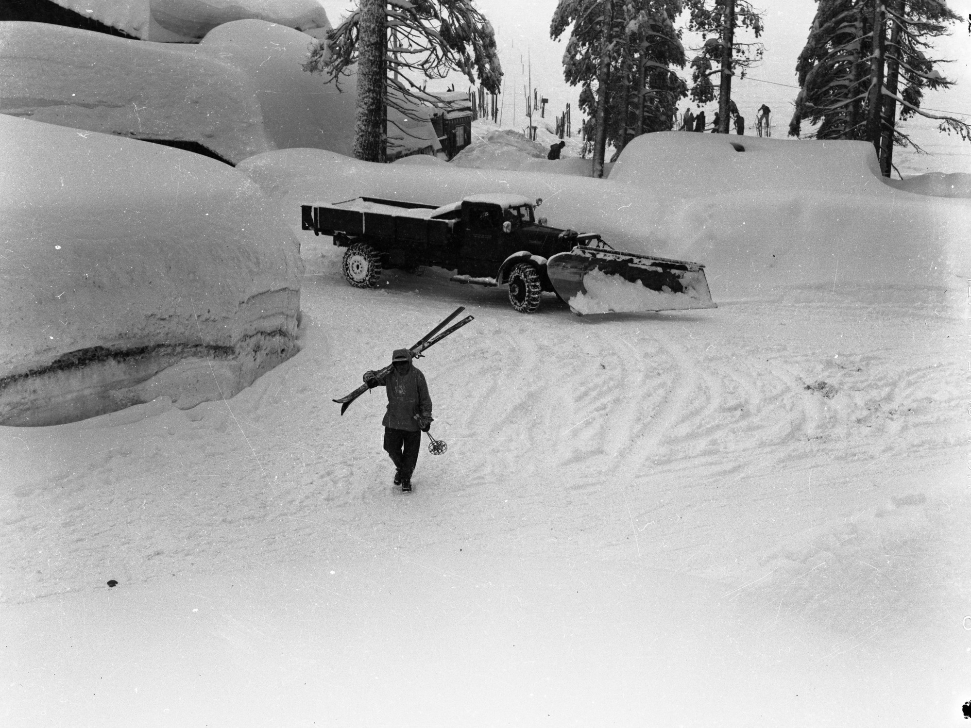 Badger Pass under 14 ft. snow depth. E.C. Smith and Ed Renner, engineers, pose to show depth.