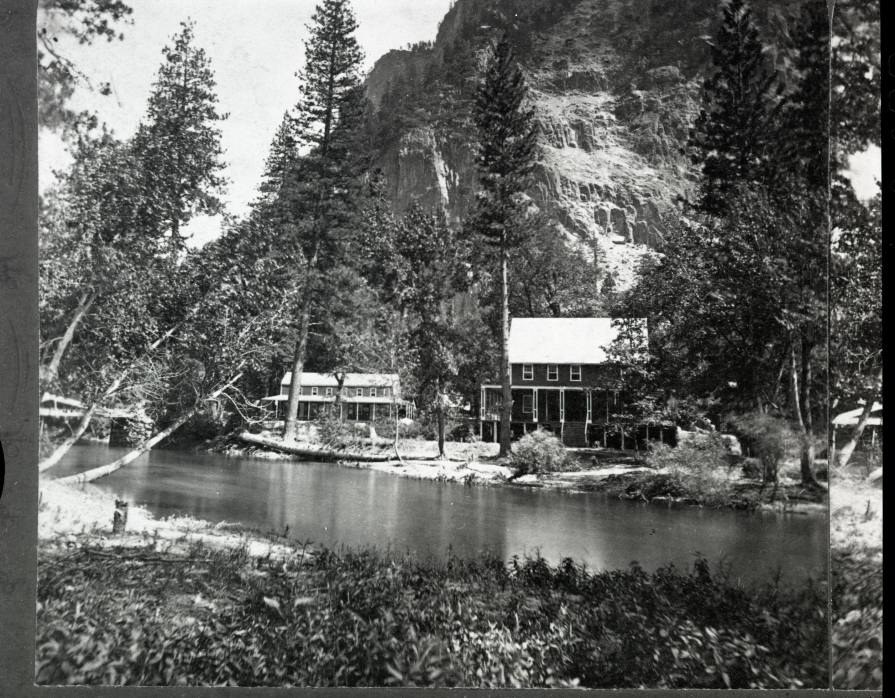 Detail of L. Smaus stereo (RL-16,520). Caption: "109. Hutchin's Hotel and the Merced River." copied by Michael Dixon, copied July 1985
