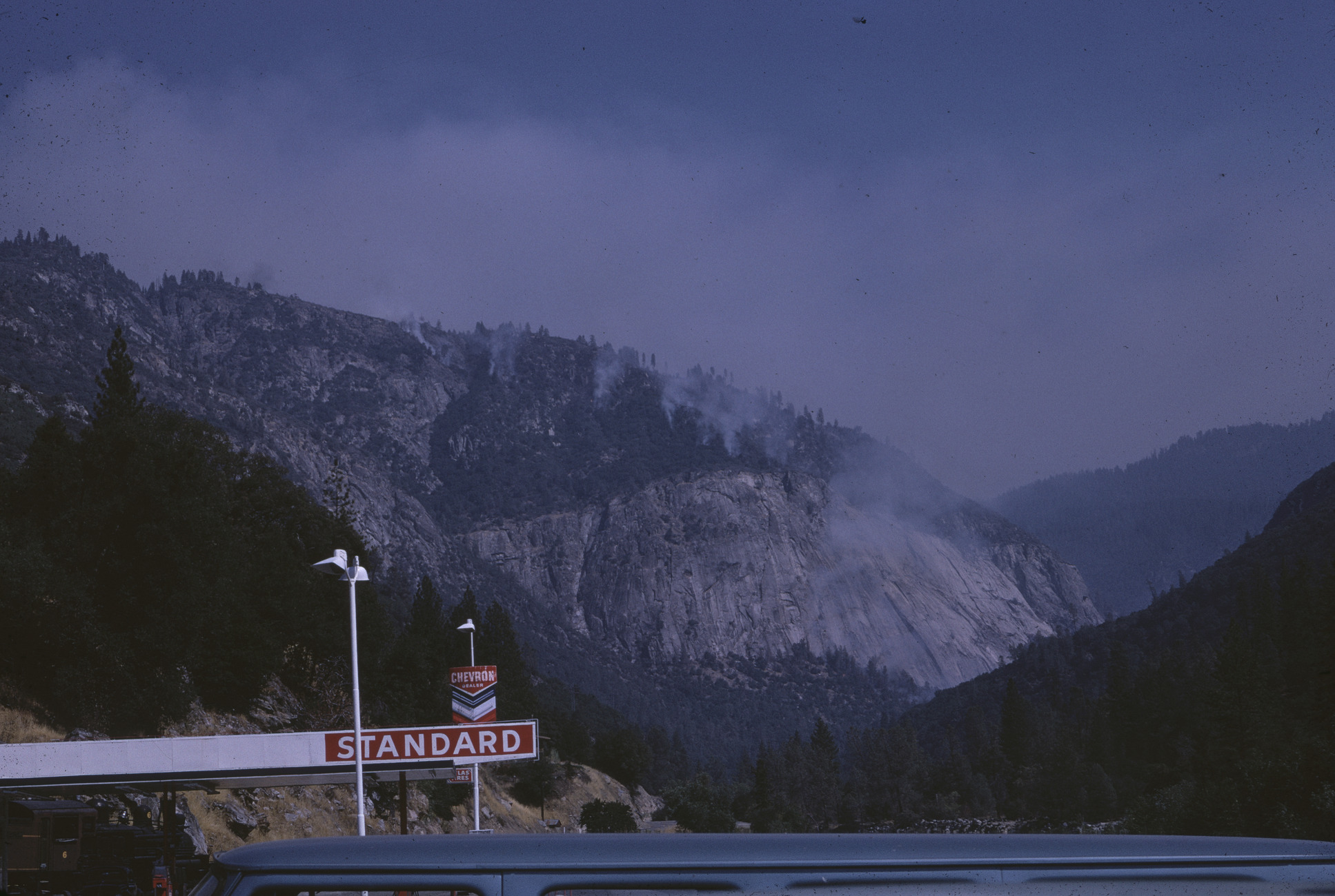 RD81. October 1968. Same fire from El Portal; Canyon fire (USFS) [United States Forest Service] burned up from El Portal to W. [west] side of Foresta. [View of canyon fire with Chevron gasoline station in foreground]. Robert Dunnagan. J-01-25-081.