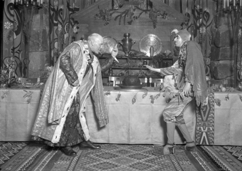 (Rehearsal after Christmas party). Squire Bracebridge (Don Tresidder) and the fish course. Lackeys Jeff Thomson and Pete Thomson. Bohemian Club singers.