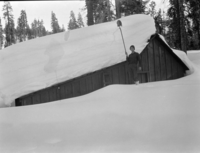 Overhanging Rock snow cornice on Horse Ridge. [From the tip of Horse Ridge, Ostrander Lake looks like a soft white blanket among the lodgepole pine trees. The Ostrander Lake Ski Hut may be seen beyond the Lake, while beyond extends a sea of High Sierra pea