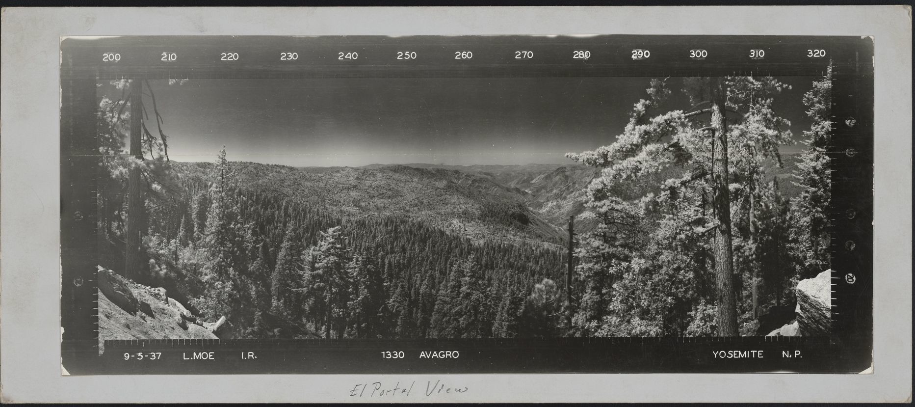 Content: SERIES X: Panoramic Fire Lookout Photographs, 1934-1935, 1937. This series consists of a set of forty panoramic photographs taken from fire lookouts and lookout points (proposed lookout sights) in Yosemite National Park. Most photographs were taken in 1934, though a few date to 1937. They appear to be part of a U.S. Forest Service (USFS) project conducted around this time, although scant documentation about the photographs and about the USFS project exists in the National Park Service (NPS) archives. Accompanying the images is a letter to Superintendent C.G. Thomson of Yosemite National Park, dated 1935 and signed by the project photographer, Lester M. Moe, USFS forester/photographer. The letter lists the panoramic photographs to be donated to a variety of Yosemite locations and is paired with a distribution list that outlines the specific photographs to be given to each ranger station, office, and lookout in Yosemite National Park and in Sierra and Stanislaus National Forests. The letter and envelope mention enclosed vertical angle scales (to assist with image viewing), but these are not present in the collection. Lookout points in Yosemite National Park contemporaneous with these photographs were the Merced Grove (Crane Flat) Lookout, Aspen Valley Lookout, Henness Ridge, Signal Peak, Pilot Peak, Smith Peak, Sentinel Dome, Bald Mountain, Wawona Point, and Wood’s Ridge.