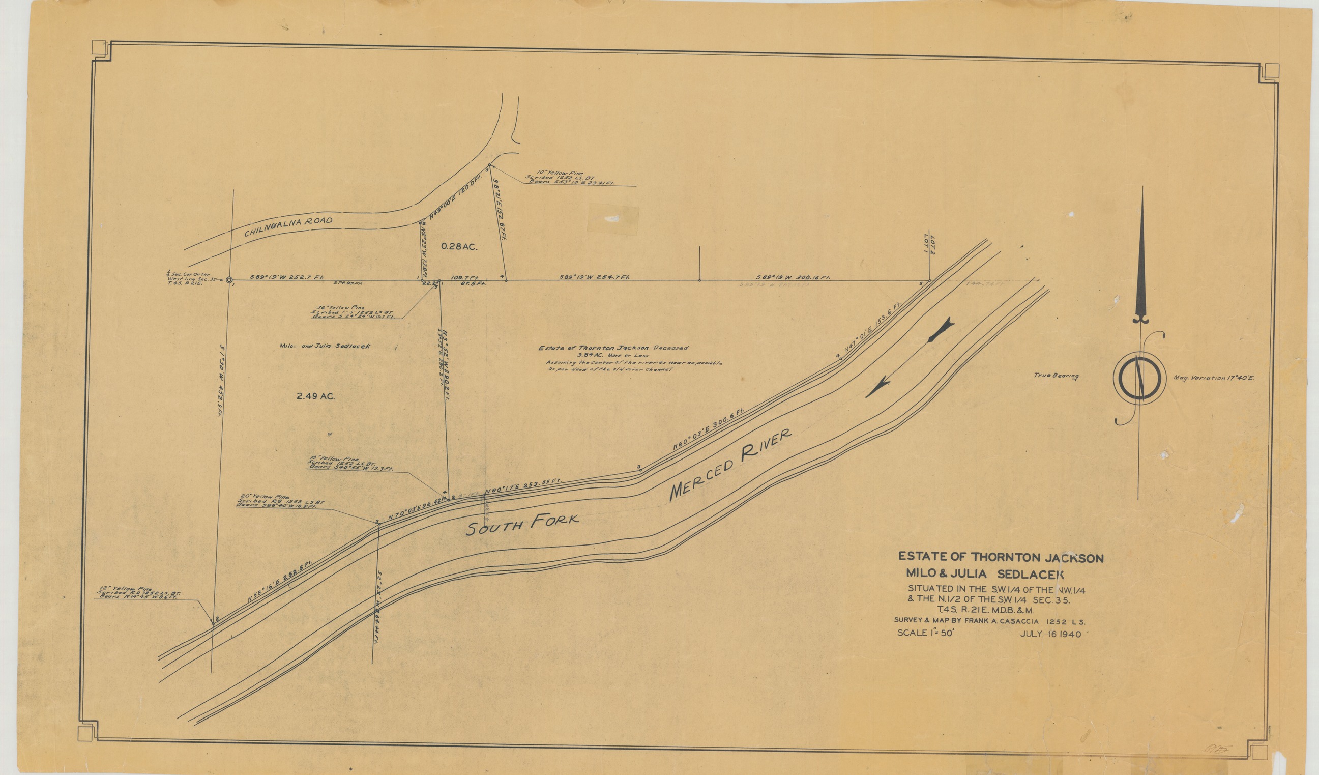 Map showing private lands of Milo and Julia Sedlacek and Estate of Thornton Jackson (deceased) situated in the S.W. 1/4 of the N.W. 1/4 & the N. 1/2 of the S.W. 1/4 Sec. 35, T.4S. R.21E. M.D.B.&M., including Chilnualna Road and South Fork Merced River