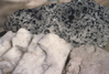 Variations in Granite Rock Half Dome Quartz Monzonite Above, C-54, DUP, D-1-f-3, C-03-03-009, [White quartz rock in foreground, black spotted monzonite in background]