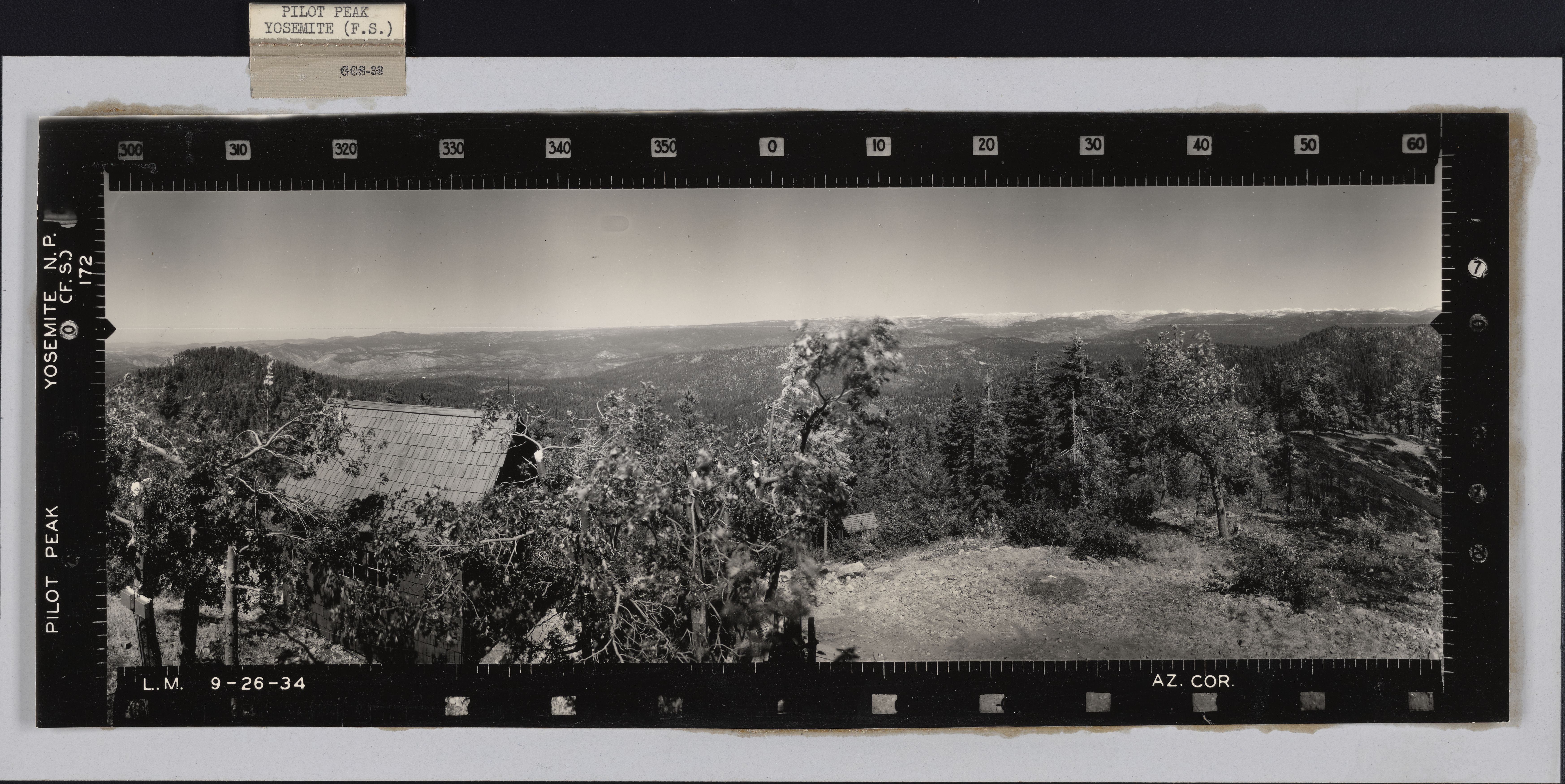 Content: These photographs provide excellent documentation of Yosemite’s topography in the 1930s. Covering 120 degrees of the horizon, they were utilized for many decades by Yosemite lookouts to accurately locate forest fires. Today, in addition to conveying information about historic road and trail locations, changes in vegetation and landscape, and geomorphology, they provide a visual juxtaposition to later photographs that is useful for a variety of scientific, management, and administrative purposes.