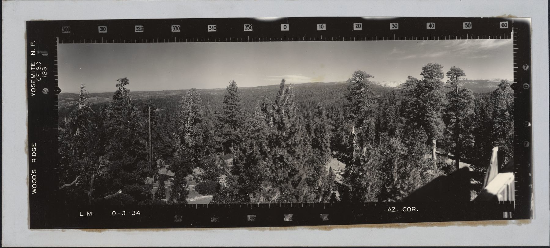 This series consists of a set of forty panoramic photographs taken from fire lookouts and lookout points (proposed lookout sights) in Yosemite National Park. Most photographs were taken in 1934, though a few date to 1937. They appear to be part of a U.S. Forest Service (USFS) project conducted around this time, although scant documentation about the photographs and about the USFS project exists in the National Park Service (NPS) archives. Accompanying the images is a letter to Superintendent C.G. Thomson of Yosemite National Park, dated 1935 and signed by the project photographer, Lester M. Moe, USFS forester/photographer. The letter lists the panoramic photographs to be donated to a variety of Yosemite locations and is paired with a distribution list that outlines the specific photographs to be given to each ranger station, office, and lookout in Yosemite National Park and in Sierra and Stanislaus National Forests. The letter and envelope mention enclosed vertical angle scales (to assist with image viewing), but these are not present in the collection. Lookout points in Yosemite National Park contemporaneous with these photographs were the Merced Grove (Crane Flat) Lookout, Aspen Valley Lookout, Henness Ridge, Signal Peak, Pilot Peak, Smith Peak, Sentinel Dome, Bald Mountain, Wawona Point, and Wood’s Ridge.