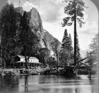 Detail of L. Smaus stereo (RL-16,520). Caption: "109. Hutchin's Hotel and the Merced River." copied by Michael Dixon, copied July 1985