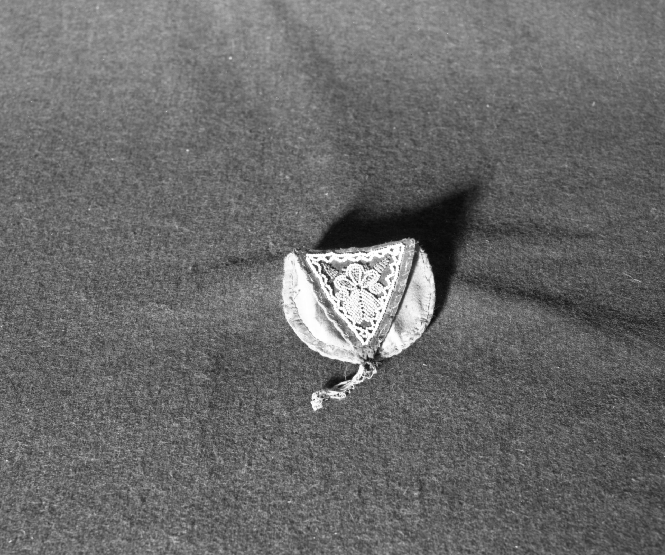 Marie Rozier Collection, Catalog No. 9. Object: Aleut hat. Dimensions: 5" x 3 1/2". Materials: beachgrass, commercial colored floss. Technology: twined, down to right slant of turns. Collection History: Gift of Ora Doyle. Photographed by Michael Dixon, Dec