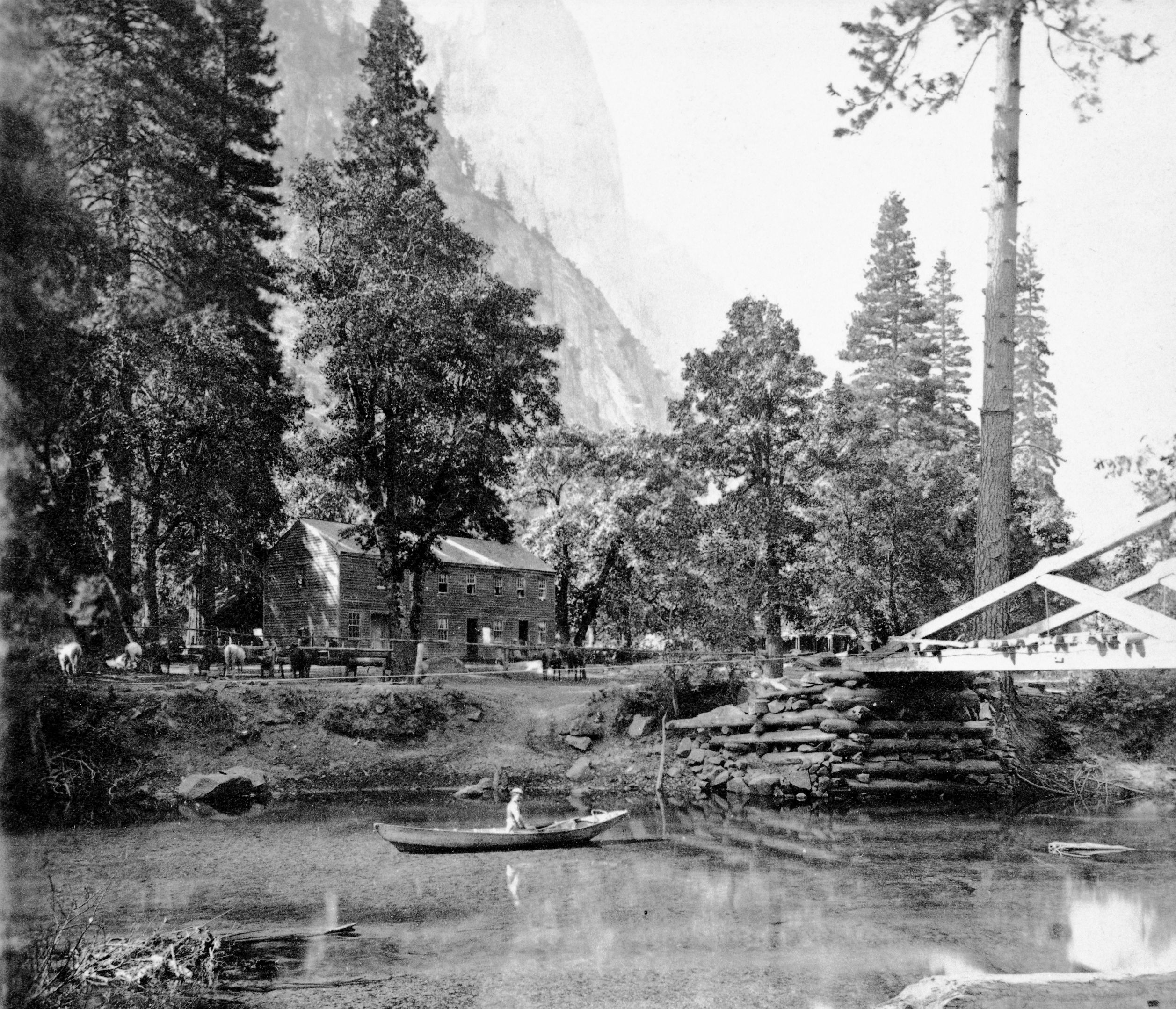 Detail of L. Smaus stereo (RL-16,520). Caption: "109. Hutchin's Hotel and the Merced River." copied by Michael Dixon, copied July 1985
