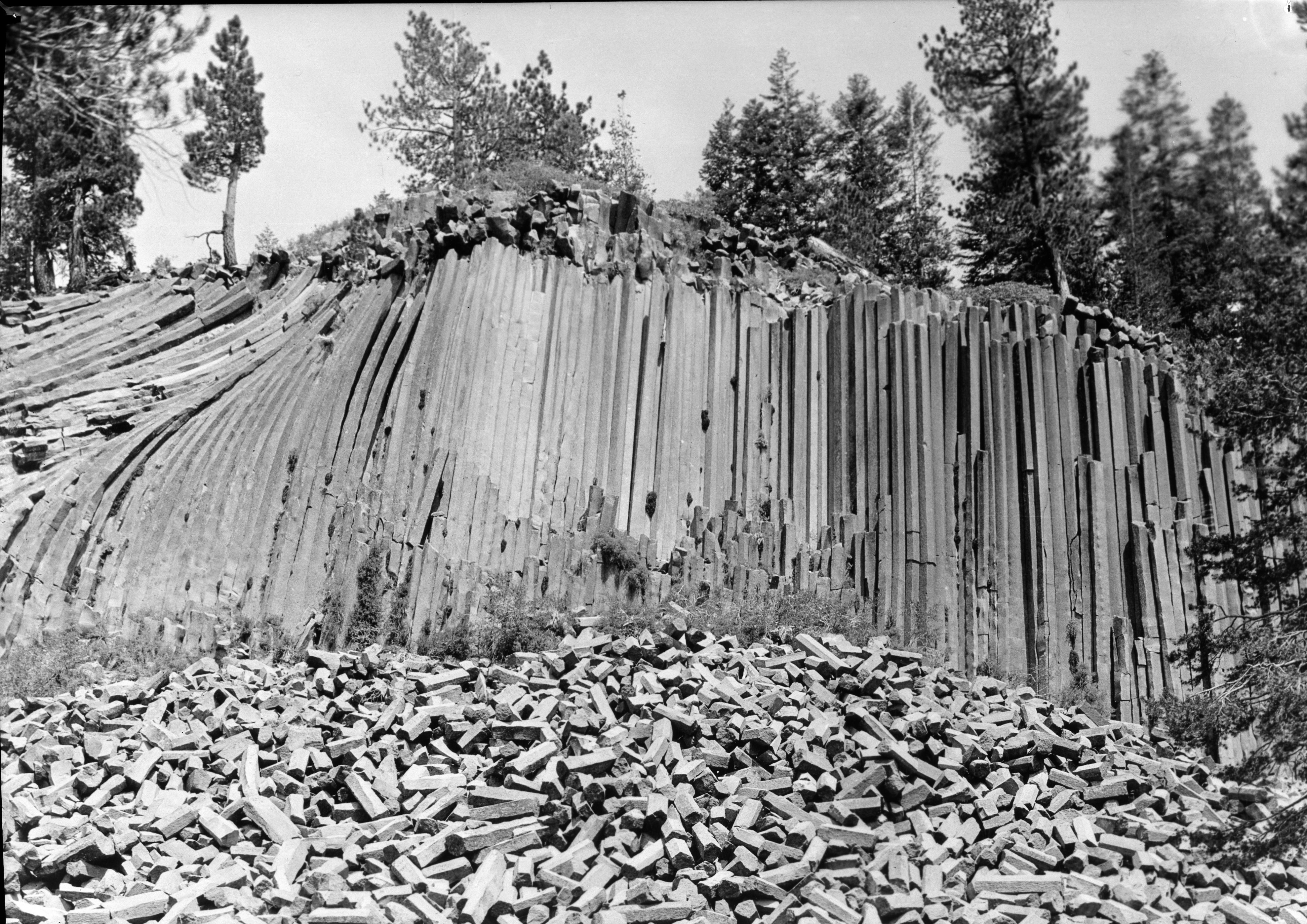 Palisades of Hexagonal Posts. Devils Postpile Nat. Monument. For geological views. Requested by Bryant on January 27, 1938. Photographed by Cather on January 28, 1938.