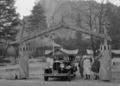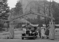Cars parked along the road in Stoneman (Camp Curry) Meadow waiting for the "Firefall," Yosemite Valley. For official negative file of Yosemite.