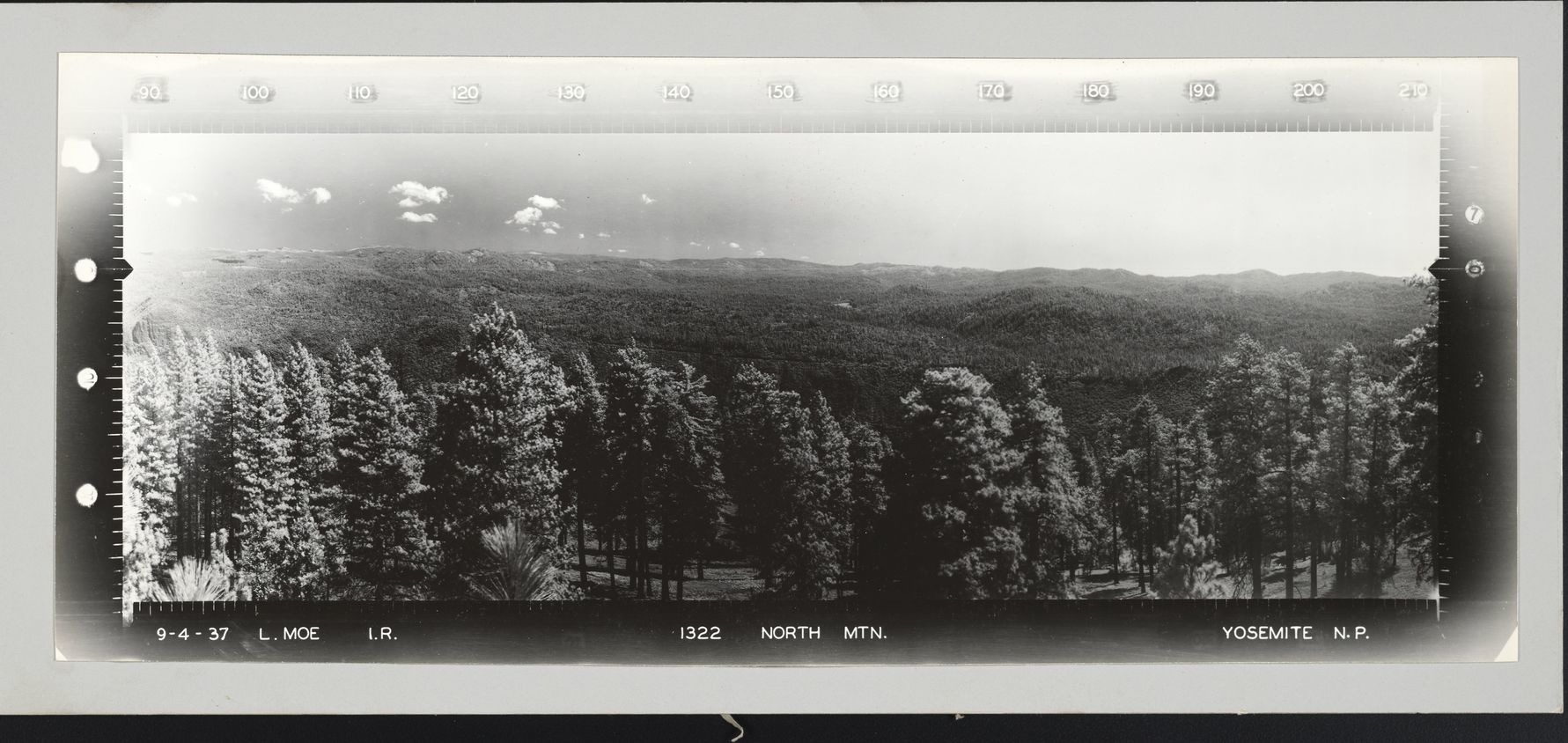 This series consists of a set of forty panoramic photographs taken from fire lookouts and lookout points (proposed lookout sights) in Yosemite National Park. Most photographs were taken in 1934, though a few date to 1937. They appear to be part of a U.S. Forest Service (USFS) project conducted around this time, although scant documentation about the photographs and about the USFS project exists in the National Park Service (NPS) archives. Accompanying the images is a letter to Superintendent C.G. Thomson of Yosemite National Park, dated 1935 and signed by the project photographer, Lester M. Moe, USFS forester/photographer. The letter lists the panoramic photographs to be donated to a variety of Yosemite locations and is paired with a distribution list that outlines the specific photographs to be given to each ranger station, office, and lookout in Yosemite National Park and in Sierra and Stanislaus National Forests. The letter and envelope mention enclosed vertical angle scales (to assist with image viewing), but these are not present in the collection. Lookout points in Yosemite National Park contemporaneous with these photographs were the Merced Grove (Crane Flat) Lookout, Aspen Valley Lookout, Henness Ridge, Signal Peak, Pilot Peak, Smith Peak, Sentinel Dome, Bald Mountain, Wawona Point, and Wood’s Ridge.