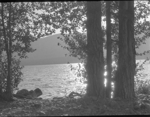 McDonald Hotel, Glacier Park, 52-8a 3x4, August 14, 1931, scenery, Lake McDonald thru cottonwood