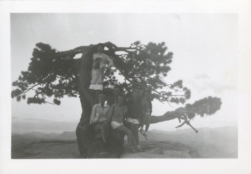 Group of nurses sitting in Sentinel Dome's historic Jeffrey Pine