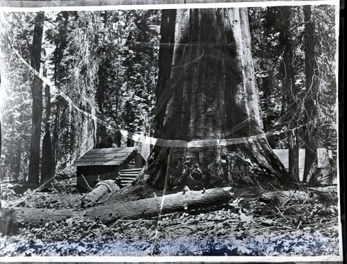 Galen Clark's Cabin in Mariposa Grove; Photo made on 18x22 glass plate. From Carleton E. Watkin's original, copied January 1936