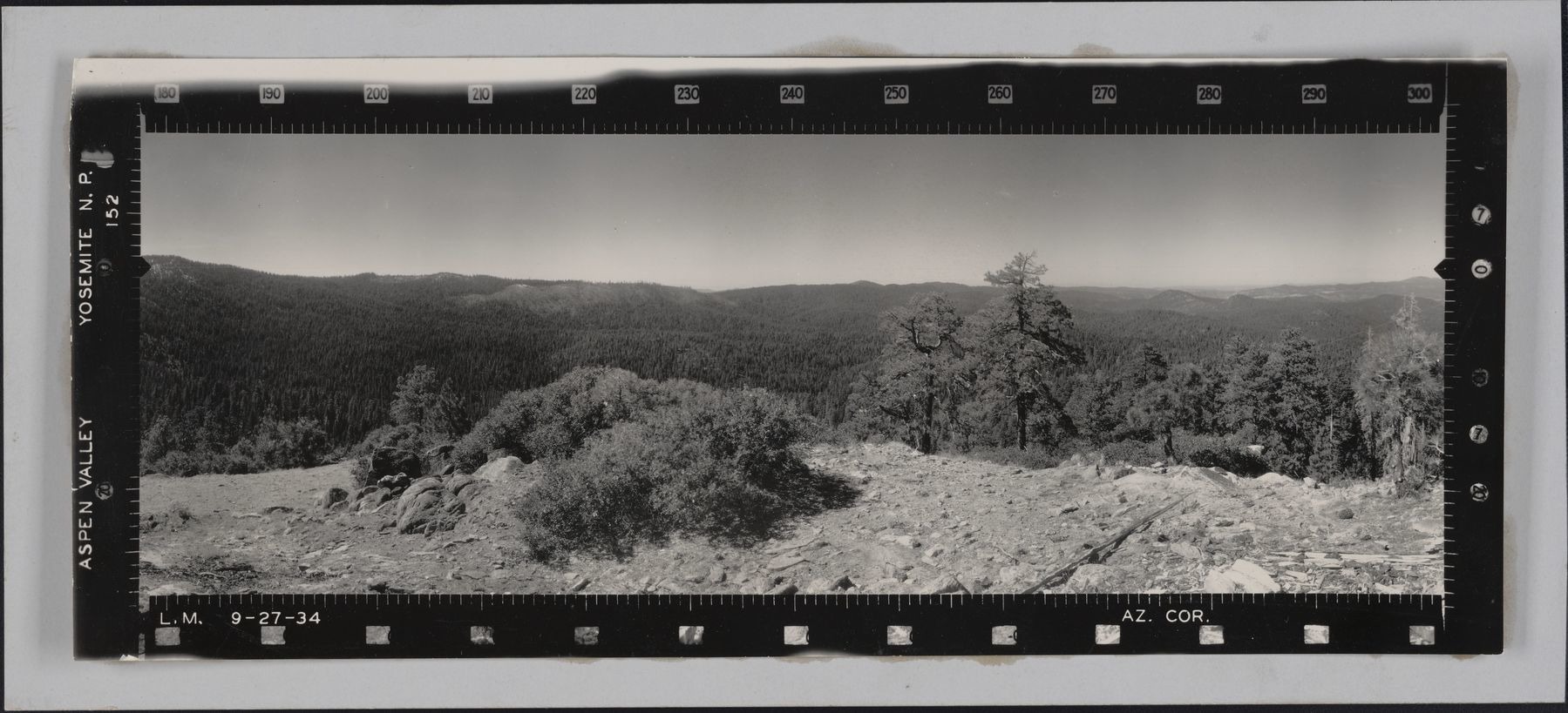 panoramic photograph; tri-fold; left; no markings and titles; no adhesive, separated from fold. 40.5 x 17.5 cm (first of ucm_ucce_yose6386_aspenvalleyyosemite_002_002 and ucm_ucce_yose6386_aspenvalleyyosemite_002_003) (121.5 x 17.5 cm)