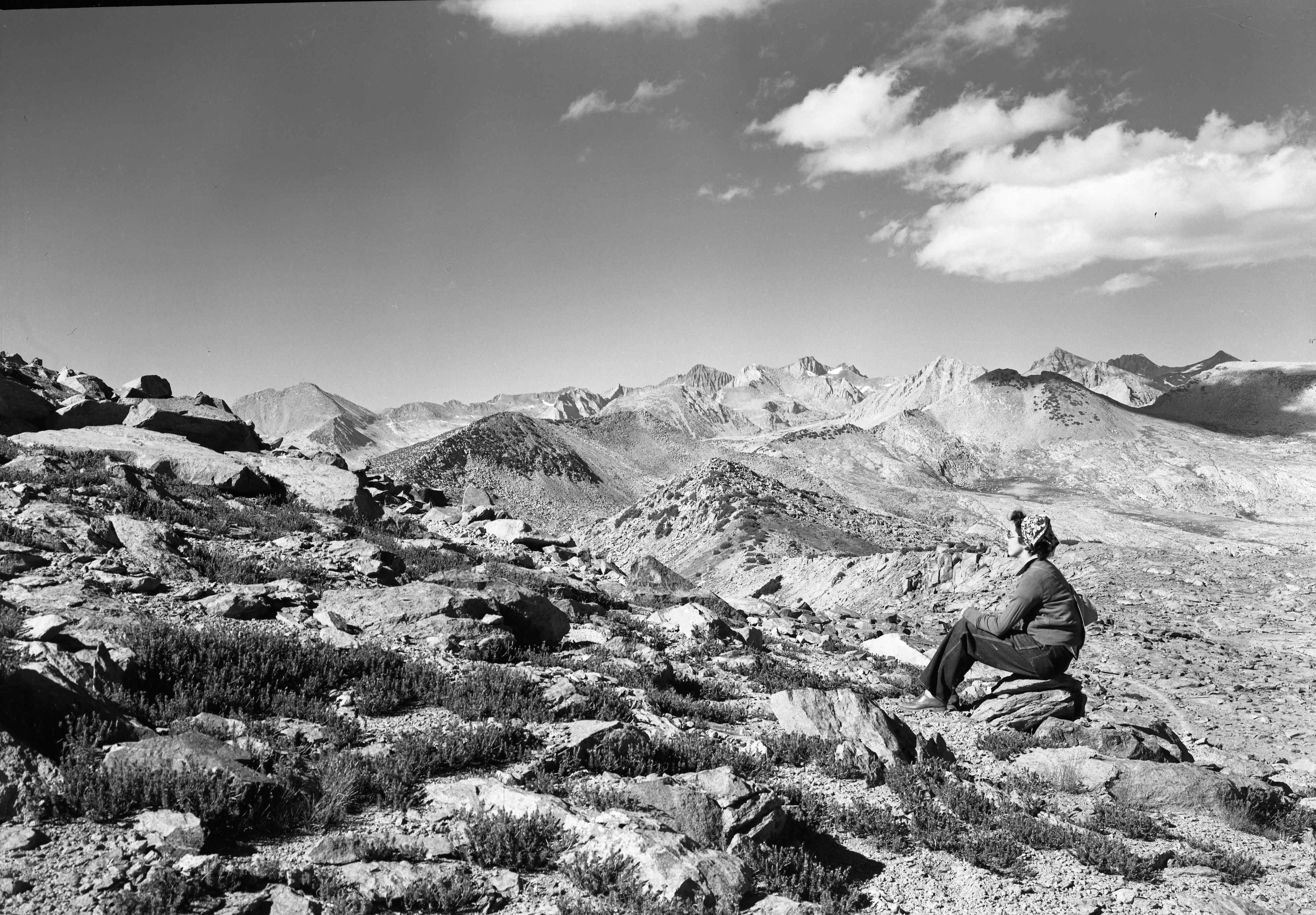 Post Peak Pass (Mt. Florence, Maclure, and Lyell in background). Mary During as weary hiker in foreground.