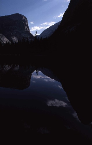 A-22-079-097 [Mt. Watkins, view from Mirror Lake, reflection on lake of trees, mountains, and clouds, Yosemite Park and Curry Company]
