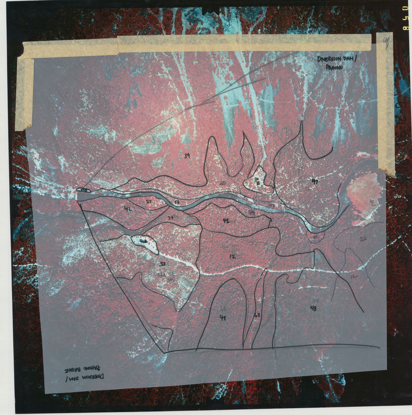 Satellite image with plastic overlay showing numbered sections
