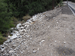 Boulders, gravel, soil, and broken vegetation pushed off into a drainage ditch to the side of the road.