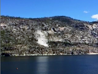 A rock fall occurred from the north wall of Hetch Hetchy Valley, between the Beehive switchbacks and Tueeulala Falls, and above the Rancheria Trail. Rock debris fell all the way to the talus slope at the base of the cliff, knocking over oak trees and leaving a few small boulders on the Rancheria Trail. The source area and runout path were covered in dark brown dirt which was moist from recent rain.