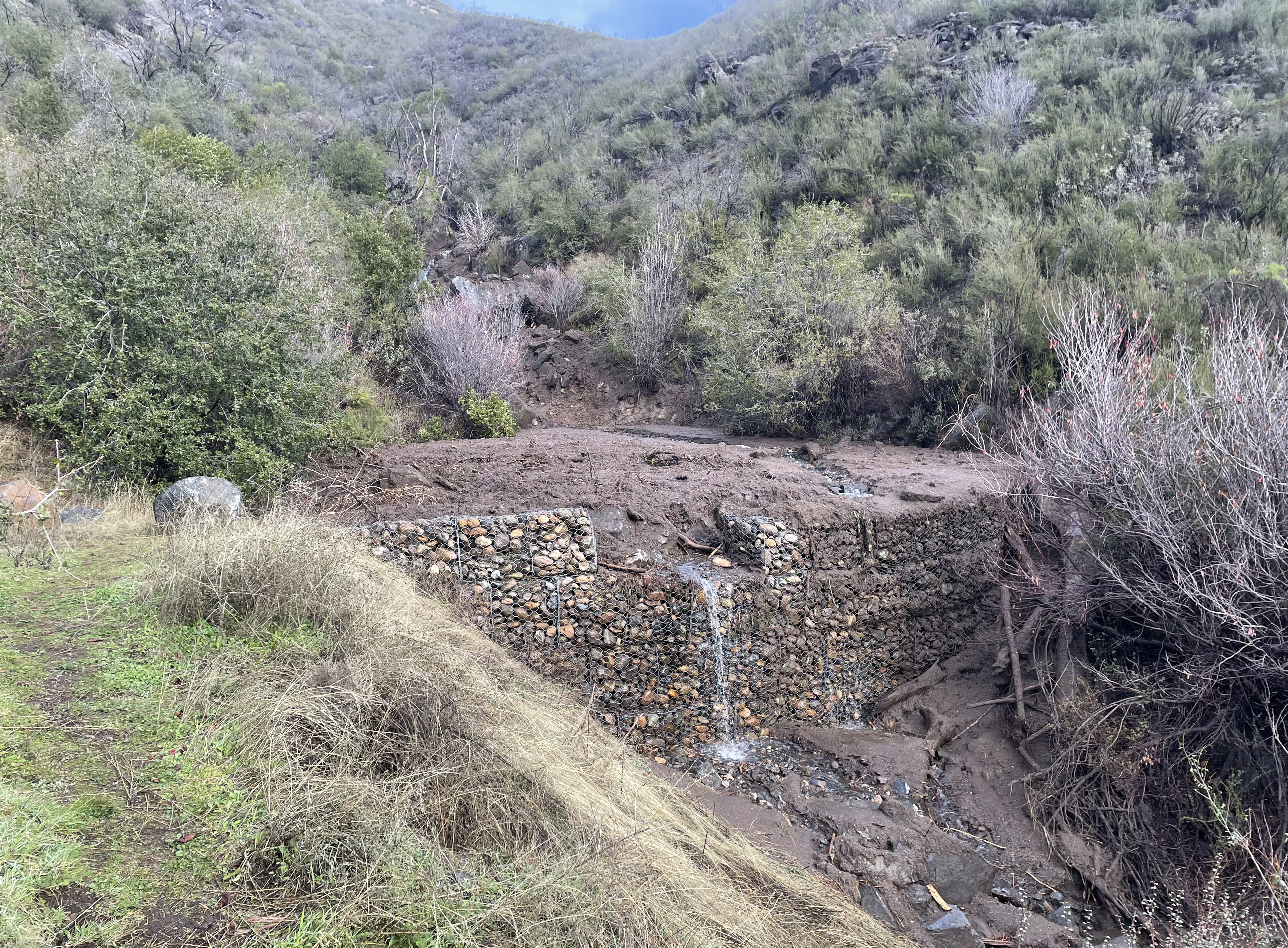 A passing debris flow damages an erosion control gabion and fills its upslope basin with sediment past capacity.