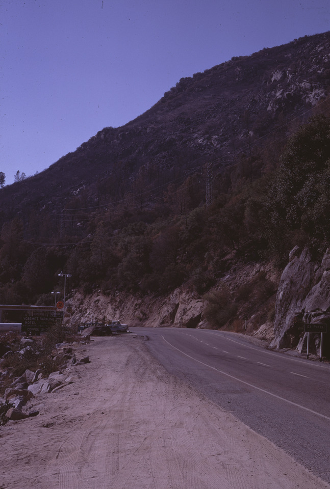 RD82. October 1968. Gulf gas sta. near W. park boundary [Gulf gas station near western park boundary]. [Fire near El Portal]. Robert Dunnagan. J-01-25-082.