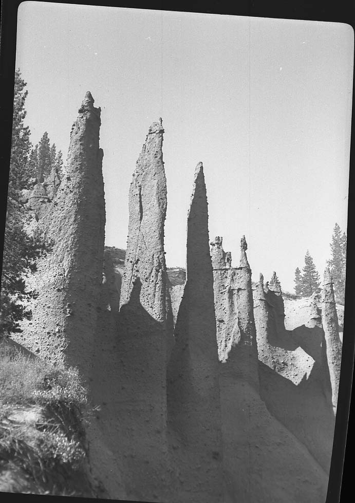 Wheeler Creek, East Entrance , Crater Lake, September 23, 1936, 2- Three Brothers against blue sky, bush in foreground, gray, yellow, 128