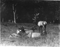 [Multiple Elk lying down in meadow with bull Elk standing], Joseph Dixon Collection, Print