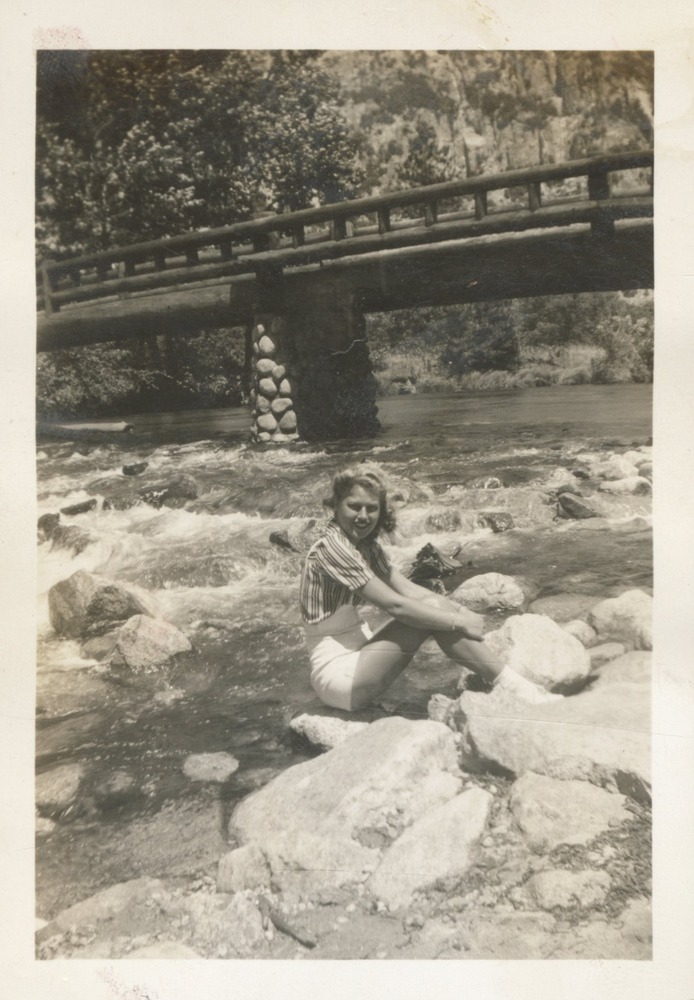 Nurse sits on a rock in the river with Housekeeping Bridge in the background